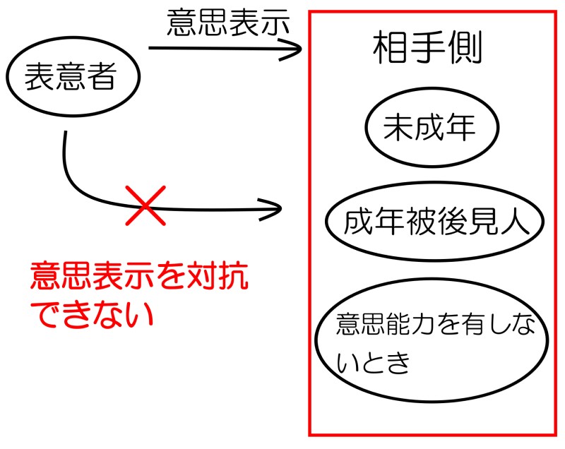 第九十八条の二 意思表示の相手方がその意思表示を受けた時に意思能力を有しなかったとき又は未成年者若しくは成年被後見人であったときは、その意思表示をもってその相手方に対抗することができない。ただし、次に掲げる者がその意思表示を知った後は、この限りでない。