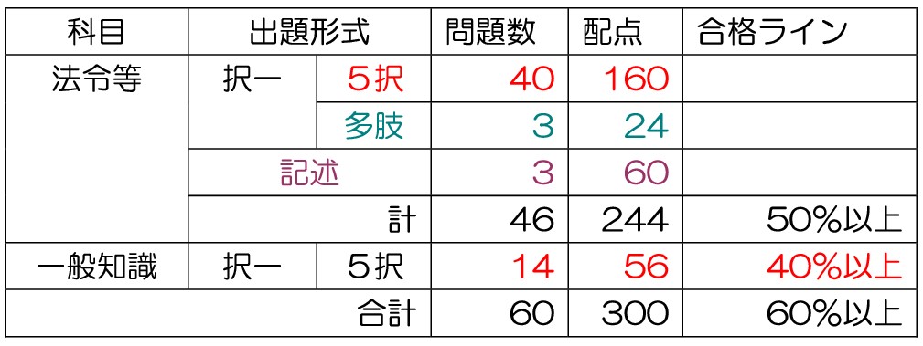点の配分上 一般知識の60%に足りない分を法令等の得点でカバーすることは出来ても、逆に法令等の60%に足りない分を一般常識で補うのは難しいです。