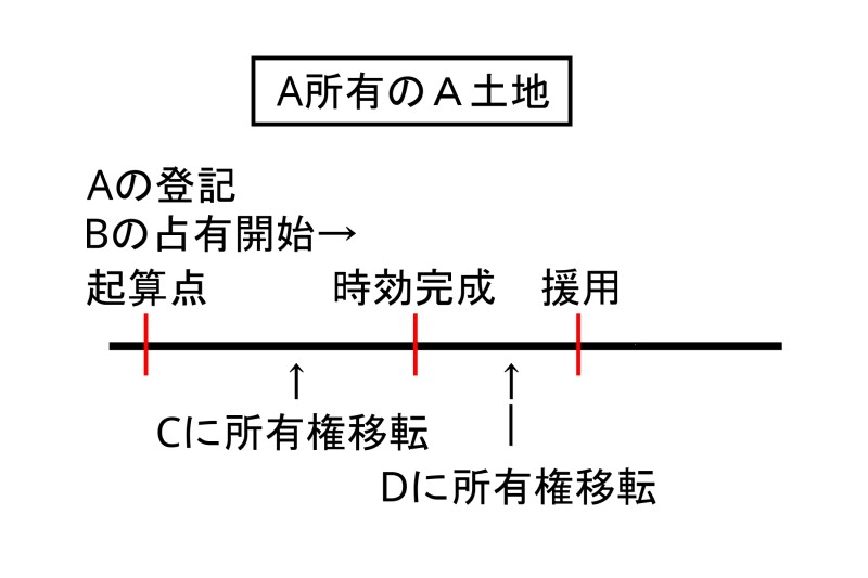 | 時効完成後占有者が援用する前に第三者が現れた | 第三者と占有者、登記の有る方が勝つ。(登記の無い占有者は対抗できない) | Bは時効が完成していますが登記が無ければDに対抗できません。 先に登記を入れた方に勝になります。 |